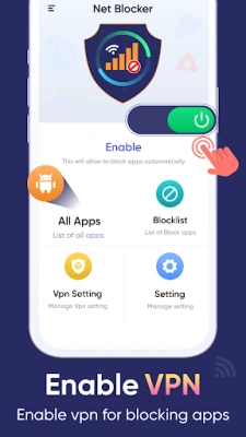 The interface of net blocker app without VPN / apps blocker has four main features including all apps, blocklist, VPN setting, and setting. The all-apps feature of net blocker for apps / block app allows the user to view all the apps installed on the device. The block list feature of net blocker pro / block internet permits the user to view all the apps that are blocked by the user. The VPN setting feature of net block app / block application lets the user manage the VPN settings of the device. The settings feature of the blocker app / apps blocker authorizes the user to manage the settings of the app.