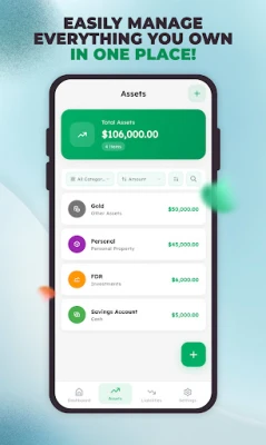 Quickly add all your assets (like savings, investments, real estate) and liabilities (like loans, credit cards). The app calculates your net worth in real-time, so you always know where you stand financially.