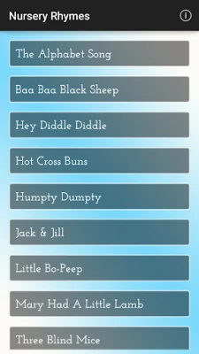 Rhymes included are - * The Alphabet Song * Baa Baa Black Sheep * Hey Diddle Diddle * Hot Cross Buns * Humpty Dumpty * Jack & Jill * Little Bo-Peep * Mary Had A Little Lamb * Three Blind Mice