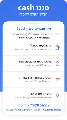 * פנגו קאש- צבירת קאש לחניות בכחול לבן . 1 ₪ על כל נסיעה בתחבורה ציבורית, 10 אג' על כל ליטר תדלוק בתחנות סונול, 10% מעלות השטיפה.