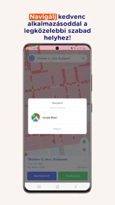 A Parkerben kiválaszthatod úticélod, de a navigációhoz nyugodtan használhatod kedvenc navigációs alkalmazásod. Úticélod közelébe érve a Parker emlékeztet, hogy térj vissza az alkalmazásba, hogy lásd a környékeden lévő szabad parkolóhelyeket.