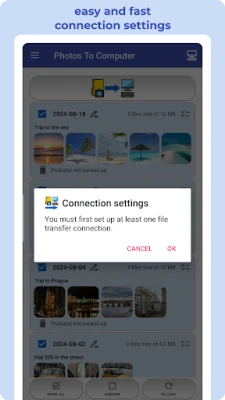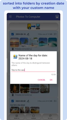 Regular use of PHOTOS TO COMPUTER allows for a one-click backup of your device's photos and videos to your computer, employing the advanced protocols of SMB, SFTP, or FTP. The app arranges copied media into folders based on their capture date, ensuring a systematic backup of your life's moments. It also facilitates the creation of multiple folders on a single day, enabling organized thematic backups within your daily folders.