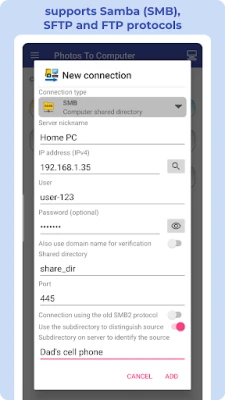 The π· PHOTOS TO COMPUTER app simplifies the transfer of your photos and videos from your phone to your π₯οΈ PC or π NAS server. It intelligently categorizes them into folders based on the creation date in the YYYY-MM-DD format. The transfer is done using protocols π Shared Directory (Samba - SMB), π SFTP, or π FTP.