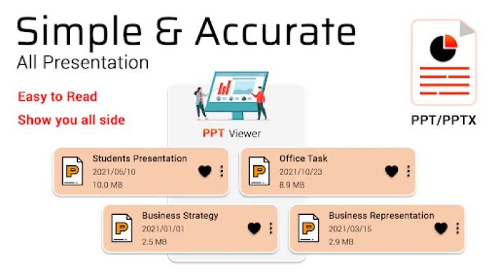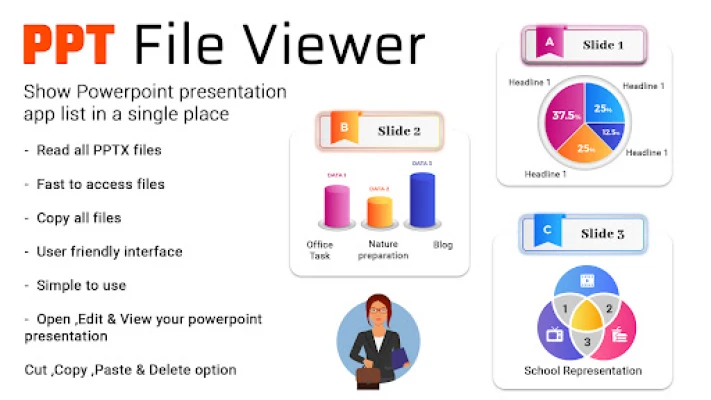 PPT viewer & PPTX file opener for slides view presentation read is free office reader app. PPT reader app lists all the PPT files on your device in one place so that you can easily check and PPT read in PPT viewer. File Viewer is easy to use and fast tool for viewing document presentation files on your device.