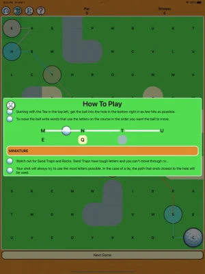 Word Building: Construct words to advance through the board. The more letters on the board you use, the fewer strokes it will take to can complete the course. Golf Strategy: Navigate around sand traps (harder letters) and rocks (empty spots). Par Challenge: Aim to complete each level in as few “strokes” as possible. Compete with Friends: Share your scores and challenge friends to see who can complete the course with the fewest strokes.