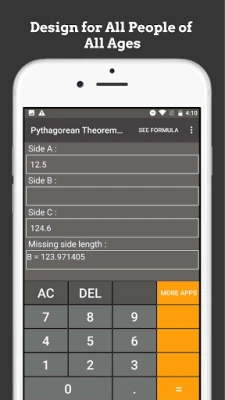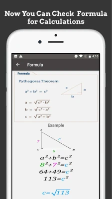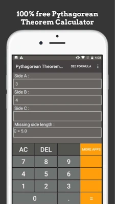 The Pythagorean Theorem states that a²+b²=c². The app will calculate the third side according to the Pythagorean Theorem.