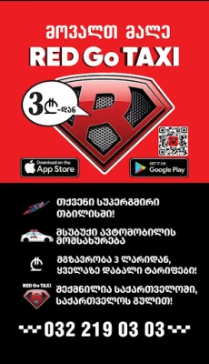 ჩვენი სერვისის გამოყენებით თქვენ მხარს დაუჭერთ საქართველოს ეკონომიკას! შენ ხარ პატრიოტი, ამოარჩიე რედ ტაქსი, მხარი დაუჭირე საქართველოს! Red Go გაუმარჯოს საქართველოს!