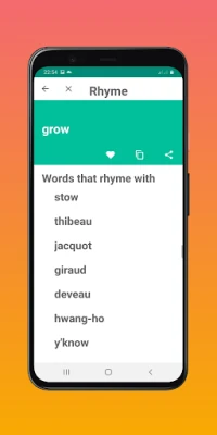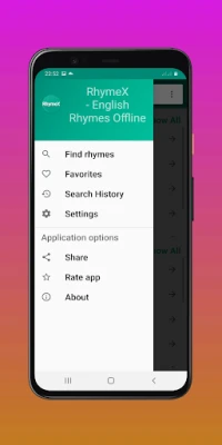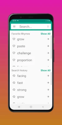 Just enter a word in the search field to find rhymes for it. There are a lot of options to improve your experience with the application including "Favorite rhymes" section and "Search History".