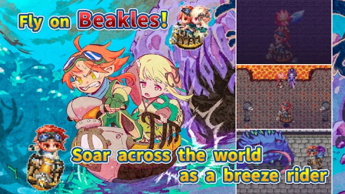 Soar on the breezes around the world in your flying Beakle, upgradable with parts to spread your accessible areas. Make use of the elementals not only in turn-based battles, but in dungeon gimmicks as well by combining character abilities. Find also the Quartzes to strengthen your party, acquire skills and techniques. Not to forget the entire world drawn with nostalgic pixel artworks!