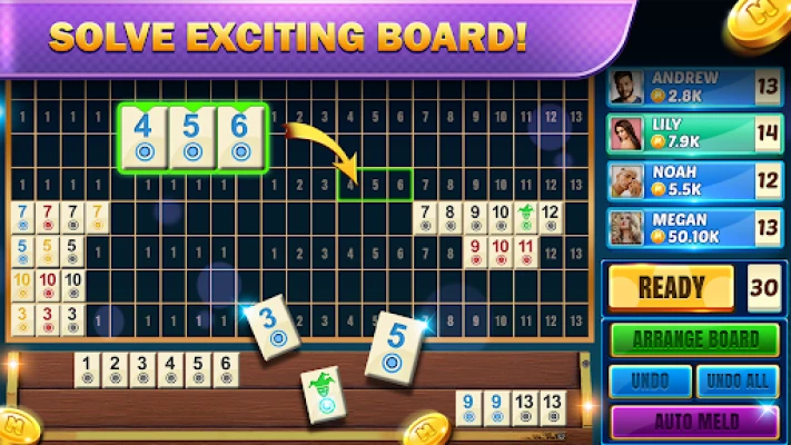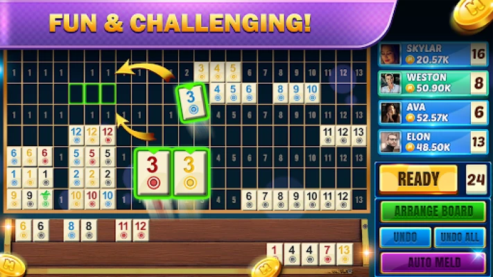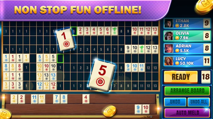 A unique version of rummy where you use tiles instead of cards to create sets and runs. Forming valid combinations like sets (same number, different colors) and runs (consecutive numbers, same color) is the key to victory.