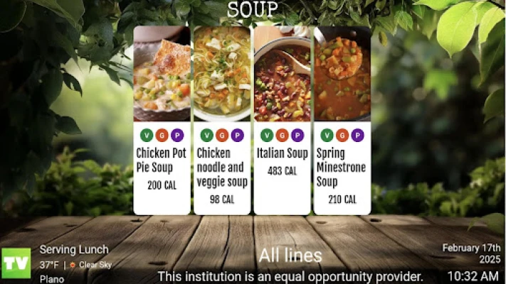 Increase student engagement with your meal programs while streamlining your digital menu management. SCTV+ makes it simple to keep students informed about daily offerings, promote healthy choices, and create an appealing dining atmosphere.