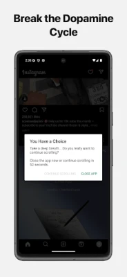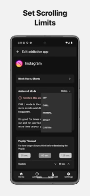 - Anti-Scroll Mode: If you scroll for too long, a customizable popup prompts you to pause for a minute or quit instantly. All settings are fully customizable per app.