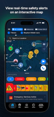 Shepherd Shield is a mobile app for use on iOS and Android phones, tablets and other devices. When a subscriber is in an area, familiar or not, the Shepherd Shield alert system provides a real-time threat assessment based on a color-coded alert index: green, yellow, orange and red, the highest.