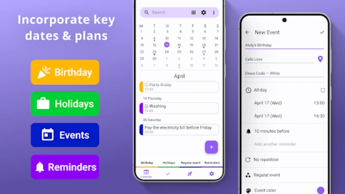 Calendar App - Daily Planner is there whether you want a sophisticated work calendar, a simple, easy-to-use day planner, or a comprehensive tool that manages everything from birthday parties to business meetings. From modifying event notification to changing the overall graphical appearance of your calendar widgets, this application is so easy to personalize. The process of managing one-time and repeating events is also basic, so nothing you care about is too difficult to achieve.