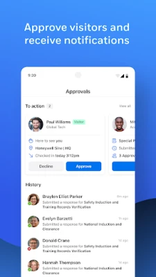 Get notified of a guests arrival and approve their arrival straight from the Approvals screen. Visitors can also receive notifications asking them if they would like to check in and out whilst inside the geofence location, as well as receiving alerts during an emergency.