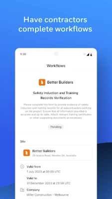 Automate company inductions and permits to work by allowing contractors to complete workflows and upload documents prior to coming to site. View and approve pending workflow responses straight from the app too.