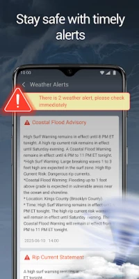 ⛈️ Extreme Weather Alerts: Get instant alerts for all kinds of extreme weather. Stay informed about heat waves, heavy rain, thunderstorms, blizzards, floods, and other extreme weather conditions.