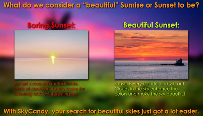 SkyCandy is great for photographers, or anyone that wants to skip boring sunsets and see only the beautiful ones. There's also many more exciting features in SkyCandy! See the below list for all of the key features: