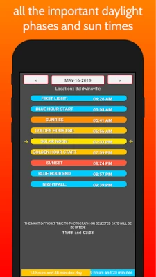 Get the exact times for Sunrise, Sunset, Golden Hour, Blue Hour, and more!