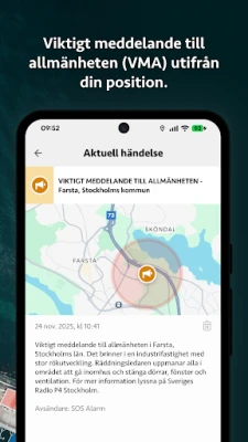 • Real-time information about incidents nearby: fires, traffic accidents, explosions, boat accidents, and people in distress in water. • Important public announcements (VMA) and other crisis-related updates. • Preventive knowledge about safety and security, such as CPR and essential phone numbers. • Guidance to help you call the right phone number when you need help.