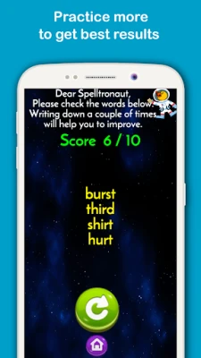 Kids learning focuses on appropriate study for different year groups so in Spelltronaut : Primary Spelling game, words are grouped in primary school year groups. The programme follows weekly spelling lists grouped in coloured rows for each term. The only thing kids need to do is to choose weekly spelling same as school learning and study at home freely and whenever they choose. After selecting weekly spelling kids will see the list of words and have time to study and learn the words before starting their weekly spelling test. Enabling tips will show an example sentence to help spelling if you are learning homophones or near homophones. It is possible to listen to the English words again if you struggle to hear them at first. Type words and click check to see if the English words are correct. If misspelt kids will see the correct spelling. At the end of the spelling test, kids will be able to see their score, their mistakes and learn from them. Study more to achieve better scores.
