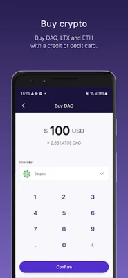 - You can purchase DAG, ETH, and LTX with a Visa®, Mastercard®, or Apple Pay. Our partner, Simplex, keeps your payment processing secure.