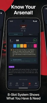 Snap a photo of any bowling ball and identify it instantly. 2,950+ balls in the database with full specs (RG, Diff, core, cover, finish). Every ball is automatically assigned to one of 8 slots – from Tank (Heavy Oil) to Spare. See the slot, strength rating, and whether it fits your bowling arsenal.