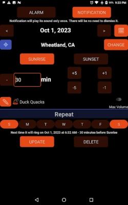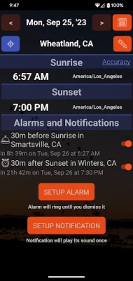 Set one time or repeating alarm based on sunset or sunrise time in the location you select. You can set a traditional alarm or a notification that will pop up on your compatible smart watch such as FitBit or Pixel Watch.