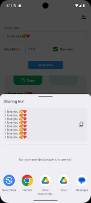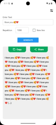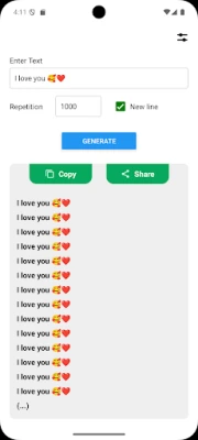 Tired of typing or pasting the same message again and again? Looking for a way to repeat text effortlessly? Introducing Text Repeater – the ultimate tool to generate repeated text with just a single tap! Whether it's to express your feelings, prank your friends, or simply save time, this app has you covered.