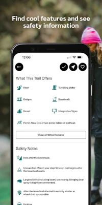 - Know whether a trail has bathroom, playground, creek, lake, or beach nearby!