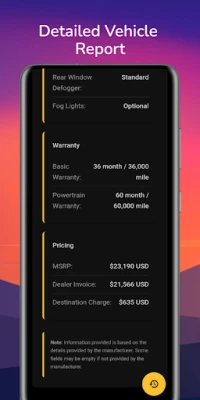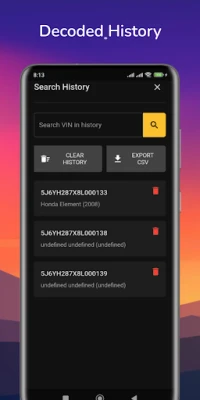 With detailed vehicle reports, you can view and export full information to a PDF file, which can be saved locally or shared. Every decoded VIN is automatically stored in your history, allowing you to review, organize, or manage previous lookups easily.