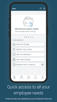 Stay updated with the latest information: Access your payslips and receive automatic notifications for incoming new ones. Register receipts and mileage expenses and send them for approval. Easily enter your work hours, register your sick leave or apply for vacation on the go.