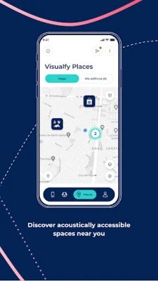• Visualfy Places: Receive emergency and informative accessible notifications by public spaces adapted by Visualfy, just by subscribing to the building services, also free of charge. Safer and always informed in hospitals, libraries, public attention offices and other public and private buildings.