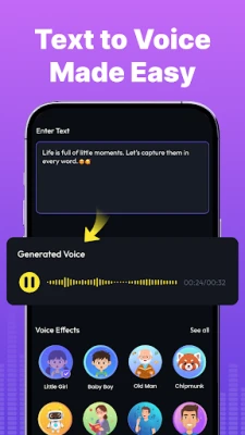 Enter any text and watch it come to life with the Text to Speech feature. Not only can you convert your written text into speech, but you can also apply various voice effects to make it more interesting. Once your text is turned into speech, add your favorite audio effects and share it with friends or on social media. It's a fantastic way to create unique voiceovers for videos, messages, or fun social media posts.