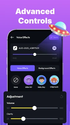 Record your voice and use AI to completely change the sound. The app offers a wide range of voice effects that can make you sound like a robot, alien, animal, or even someone famous! You can also pick any audio from your gallery and apply different sound effects to it, making your audio files more entertaining and fun. The AI ensures high-quality sound transformation with every effect, leaving you with a voice that’s anything but ordinary.