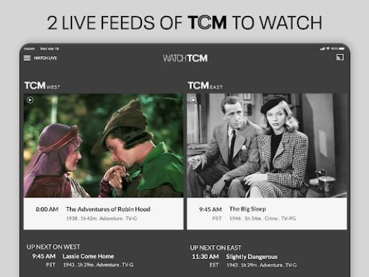 TWO LIVE STREAMS: Enjoy both an East and West Coast feed of Turner Classic Movies. Watch 2 different movies LIVE at any time, always UNCUT and COMMERCIAL FREE.