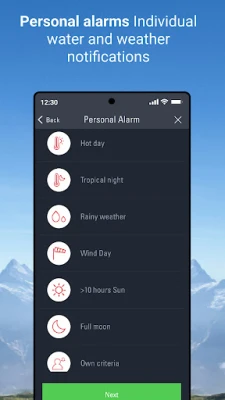 With Weather Alarm, you can set up weather notifications according to your needs. This function is ideal for not being surprised by a change in the weather on your way to work or during your leisure time.