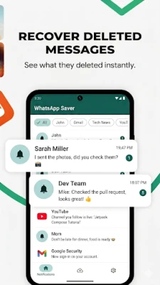 WhatsRecover helps you recover deleted messages of WhatsApp. WhatsRecover saves and displays the messages of the user deleted by the sender. It notifies you with a notification when there is a deleted message.