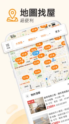 提供「地圖」及「清單」兩種搜尋模式,依照買屋、租屋搜尋條件,設定如售價、總/主建坪、格局、車位等找房條件,篩選最符合需求的中古屋、新屋、土地、套房、學生租屋、短期租屋。
