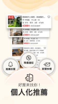 根據你的找屋喜好和需求,主動推薦適合你的房子、土地、社區、建案等房屋,省時、省力又聰明!