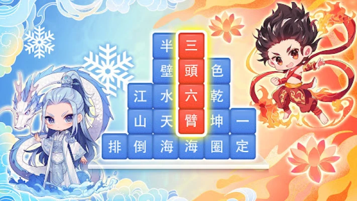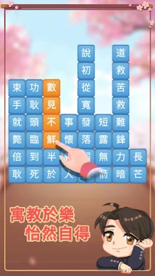 - 開局後觀察文字,可組成哪些成語,依照可連接成語順序水平或垂直滑動漢字拼接詞語,體驗接龍式成語串聯玩法。