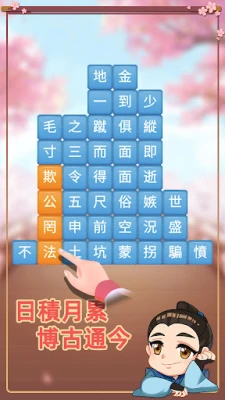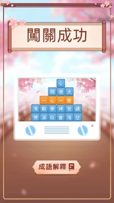 - 若成功組成成語,漢字即自動消除,方塊下落更新布局,形成新的文字組合機會。