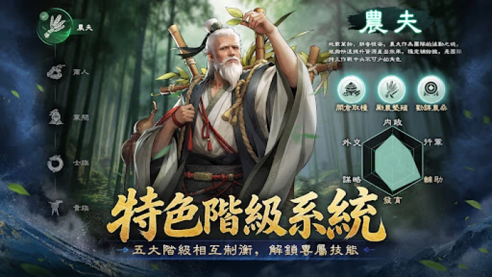 首創士農工商特色階級系統,不同職業均有特色專屬技能!你可以囤積糧食厚積薄發,也能合縱連橫顛覆朝政,告別簡單的數值碰撞,合理運用策略,上演屬於你的逆襲傳奇!