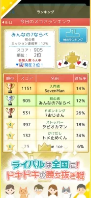 「勝ち抜き戦」モードでは、得点結果や連勝数を全国のユーザーと競い合えます。