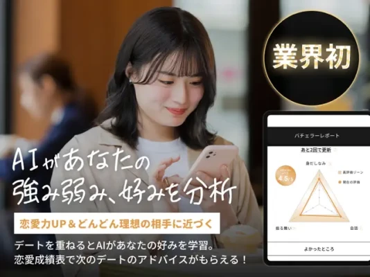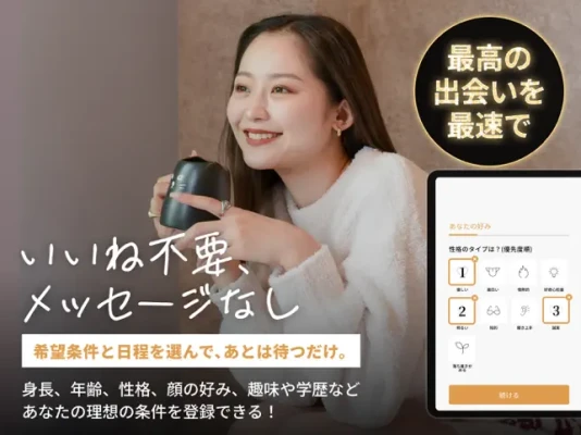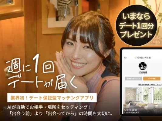 AIが好みの人と自動マッチング。いいねややりとりは一切不要で週1回デート保証!真剣な出会いを求める方のための婚活・恋活アプリです。