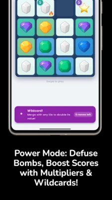 Defuse bomb tiles before they explode! Unlock multiplier tiles for score boosts, power tiles for strategic advantages, and wildcard tiles that merge with anything. Heart-pounding excitement in every move.