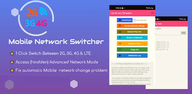 * No external interface - you will land into settings directly which saves taps. * Advanced network setting can be accessed with this app * Switch to 4G * Switch to LTE * Switch to 3G * Switch to 2G * Optimized 4g Switching * Switch to Preferred Network * LTE on off * LTE only switching * Hidden network settings for Samsung Mobile * Samsung Mobile Band Selection/ Change