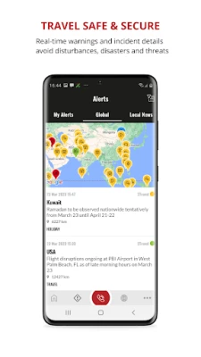 Receive push and SMS alerts to help you steer clear of trouble, such as extreme weather conditions and natural disasters, travel disruptions, political and civil unrest and terrorism threats.