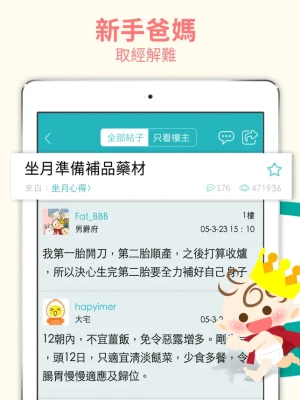 Discussion on anything during any phases of pregnancy: Experienced parents share their experience and various tips in the forum, for example, menstrual cycle count, mother’s health care, fetal development, postpartum weight loss and confinement.