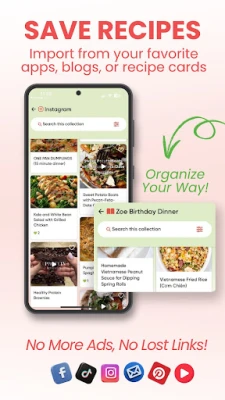 IMPORT RECIPES Never lose a recipe again. Save favorites from anywhere—Pinterest, Instagram, even handwritten cards—and organize them in custom collections, ready to add to your plan or grocery list in a tap.